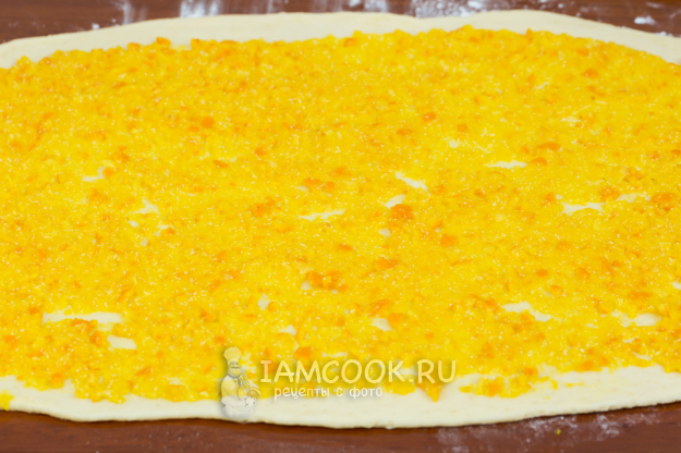 На припыленной мукой поверхности раскатайте тесто в прямоугольный пласт толщиной 5 мм.