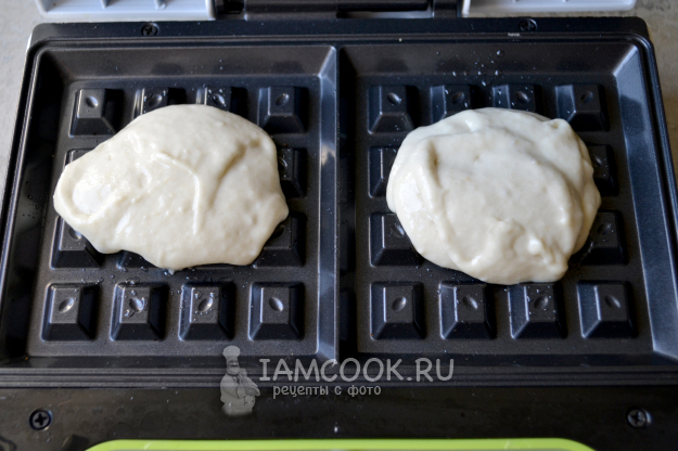 Разогрейте электровафельницу. Если необходимо, смажьте панели тонким слоем растительного масла при помощи силиконовой кисточки и положите по полной столовой ложке теста на одну вафлю.