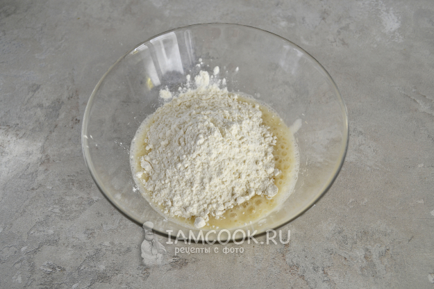 Всыпьте просеянную муку с разрыхлителем.