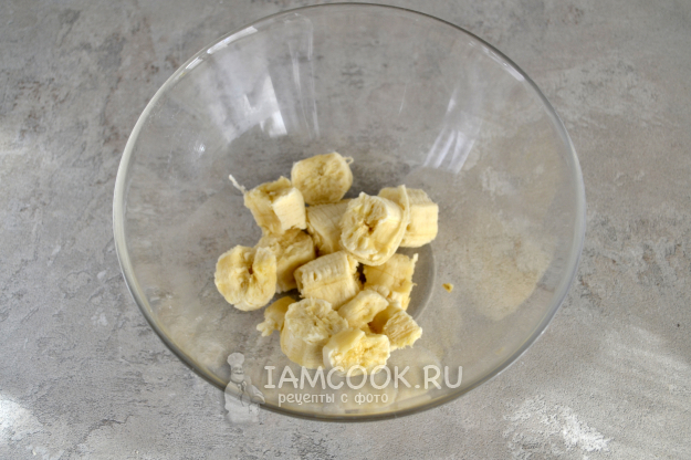 Очистите банан, поломайте его на кусочки и положите в глубокую миску.