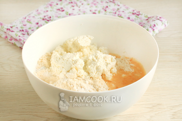 Добавьте мягкий творог и часть взбитого яйца. Оставшуюся часть яйца используйте для смазки рулета. Замесите мягкое тесто.