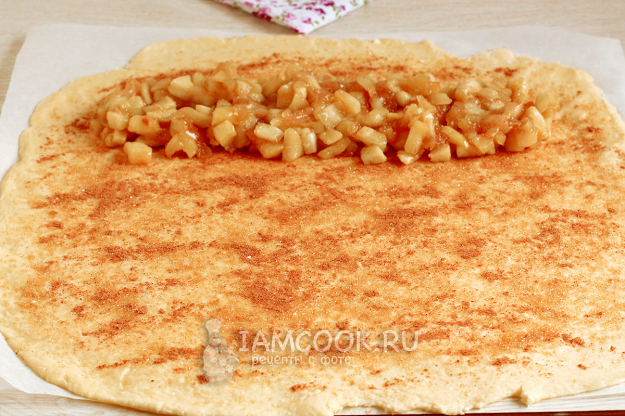 Так как в тесто не добавляется сахар, им посыпают уже раскатанное тесто. Не пренебрегайте этим процессом, чтобы рулет получился в меру сладким.