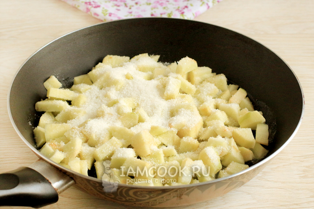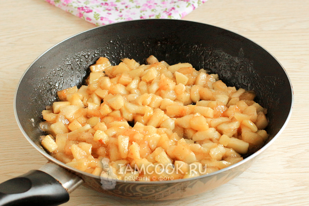Яблоки очистите и нарежьте мелкими кубиками. В сковороде разогрейте сливочное масло. Обжарьте яблоки вместе с сахаром и потушите их до мягкости. Добавьте немного или много корицы (по предпочтениям).
