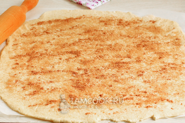 Подготовьте силиконизированный пергамент, присыпьте его немного мукой, и раскатайте на пергаменте все тесто до толщины 4 мм. Посыпьте тесто сахаром и корицей, слегка пройдитесь по нему скалкой, чтобы вдавить сахар в тесто. У меня коричневый сахар.