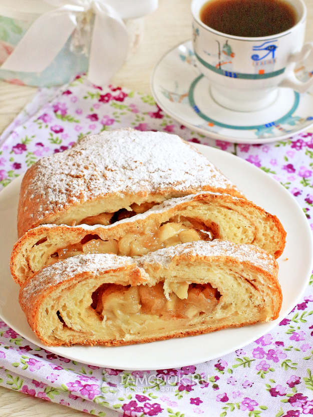 Творожный рулет с яблоками готов, его можно посыпать сахарной пудрой по желанию. Полностью остудите рулет для стабилизации структуры и легкой нарезки. Я его разрезала еще горячим.