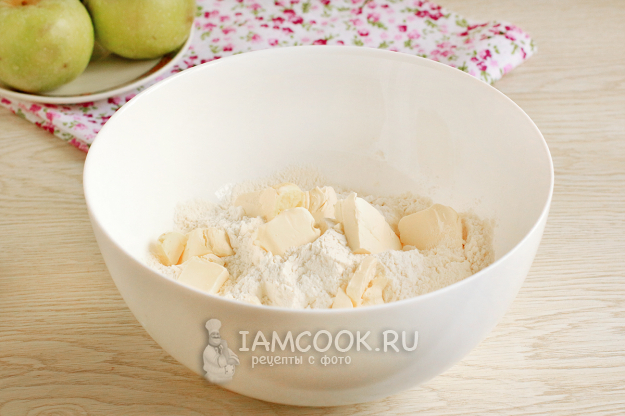 Муку соедините с солью, разрыхлителем и ванилином, перемешайте. Добавьте кубики масла и перетрите все в крошку.