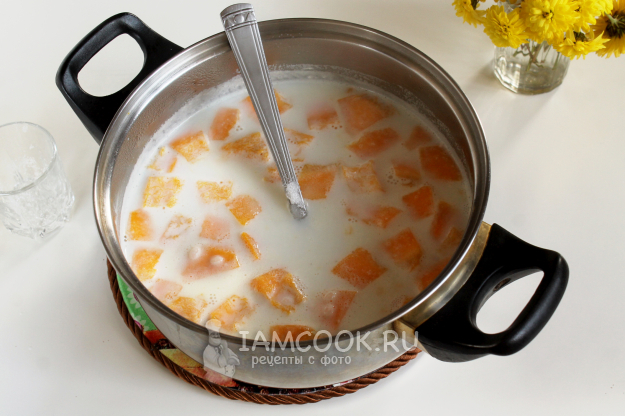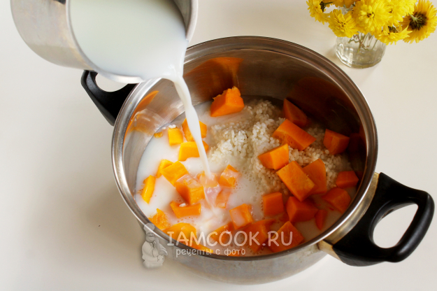 Залейте рис с тыквой молоком и доведите до кипения.