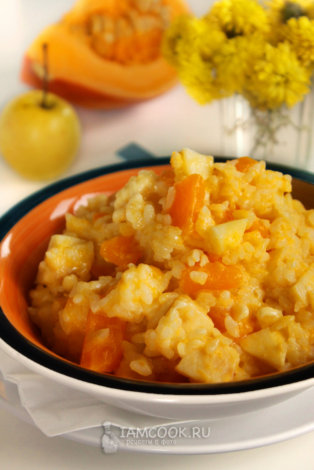 Подавайте молочную рисовую кашу с тыквой и яблоком теплой, на завтрак или в обед.