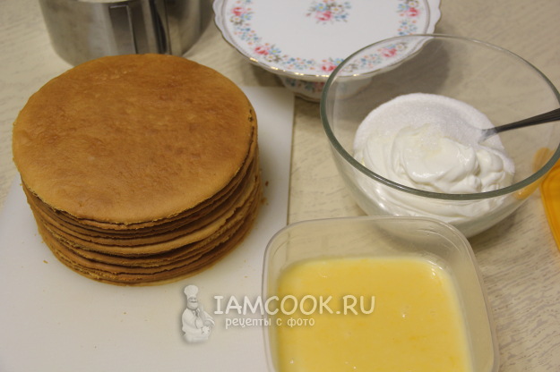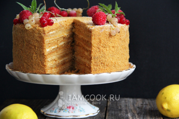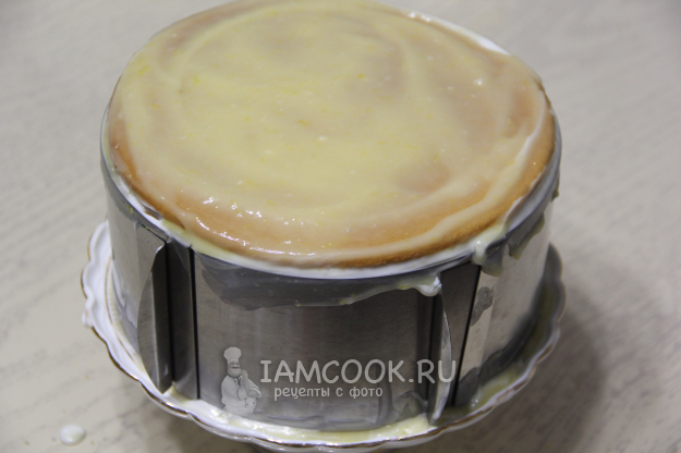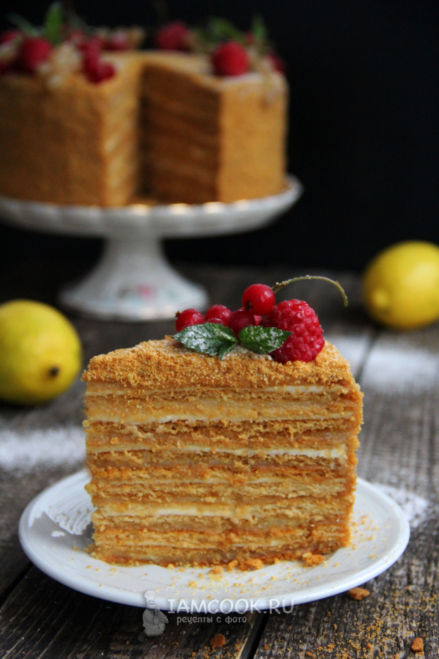 Чтобы торт был ровным, лучше зажать его в кольце. Так он прекрасно пропитается и будет ровным. Поставить торт Медовик с лимонным курдом в холодильник на ночь.