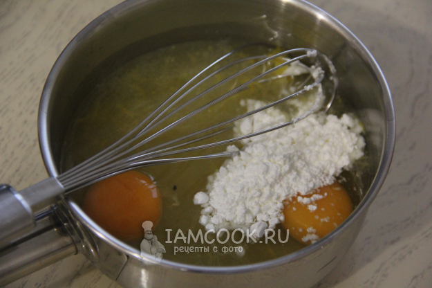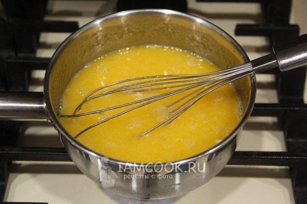 В сотейнике соединить сахар с цедрой, яйца, крахмал и лимонный сок с водой.