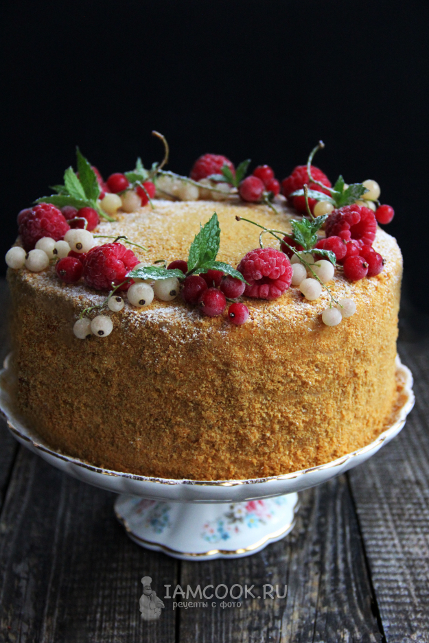 Остатки коржей измельчить в крошку. Снять кольцо и обсыпать верх и бока торта крошкой. Украсить торт можно ягодами или декоративными пчелками.