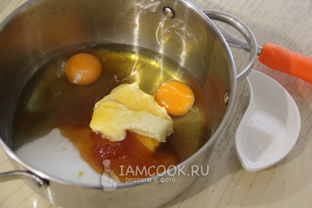 В кастрюле соединить сахар, яйца, мягкое масло и мед.