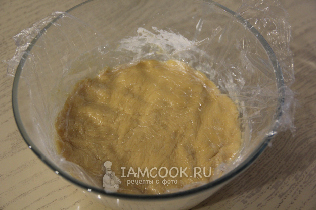 Ввести всю муку, тесто получится липким, муку больше не добавлять! Накрыть тесто пищевой пленкой в контакт и оставить при комнатной температуре на 1 час.
