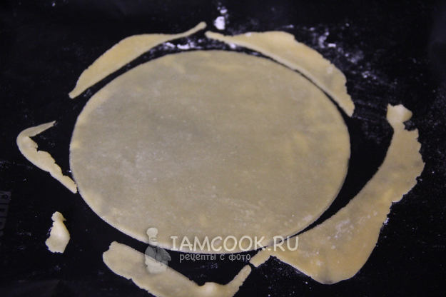 Разделить тесто на 13 частей, размер коржей будет 20 см. Раскатывать тесто сразу на тефлоновом коврике или пергаменте. Раскатать тесто скалкой в тонкий круг. Вырезать круг кольцом, остатки теста оставляем на коврике, они понадобятся нам для обсыпки.