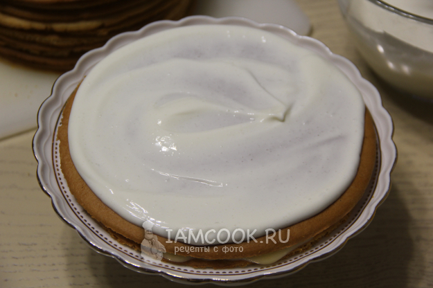 Я использовала по 2 столовые ложки крема для каждого коржа.