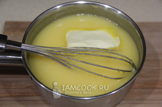 Довести массу до кипения, постоянно помешивая. Как только масса закипит, варить 1-2 минуты, а затем снять с огня и добавить мягкое масло. Перемешать курд до однородного состояния. Затем переложить курд в банку или в лоток и накрыть пленкой в контакт. Полностью остудить, я поставила курд в холодильник на ночь.
