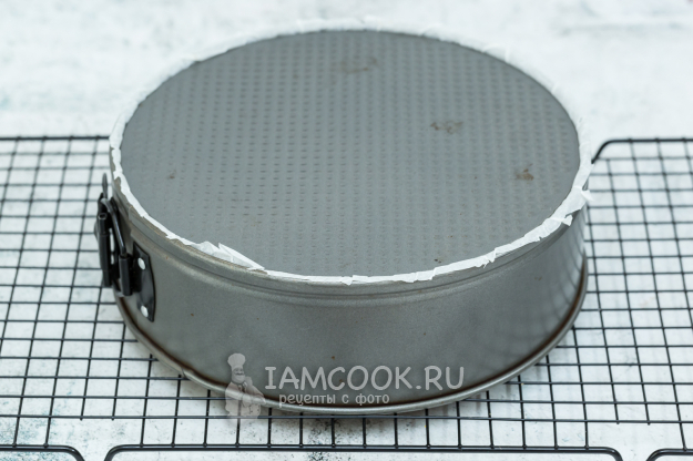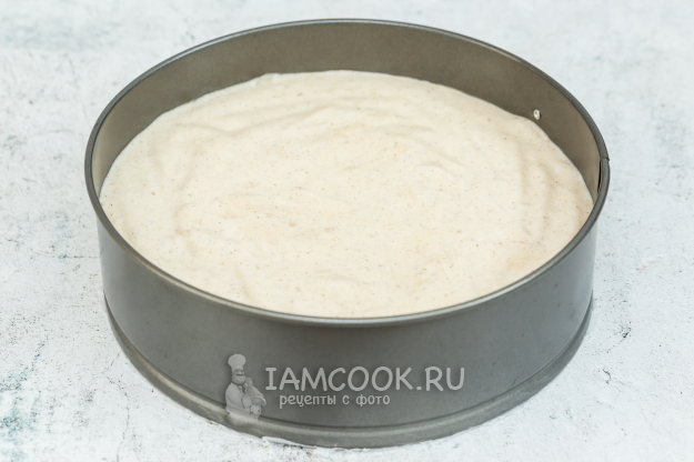 Тесто выложите в форму, дно которой застелено пергаментом.