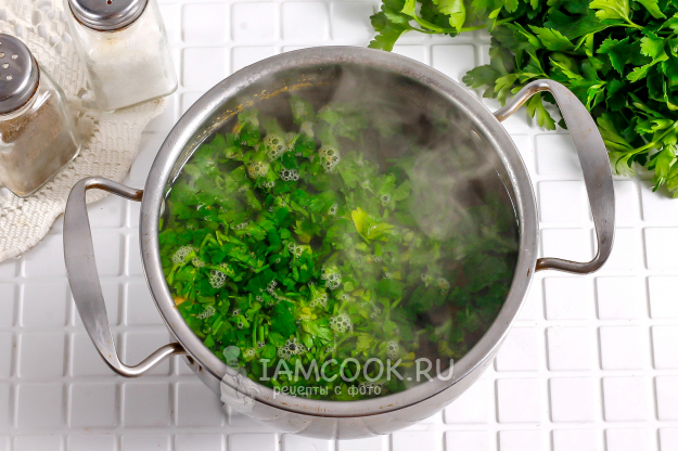 Промойте и измельчите свежую петрушку или укроп. Добавьте в кастрюлю с супом и отварите еще 3-5 минут. Попробуйте первое на вкус и подкорректируйте при необходимости. Можно спрессовать очищенный и промытый зубчик чеснока, если любите его аромат в блюдах.