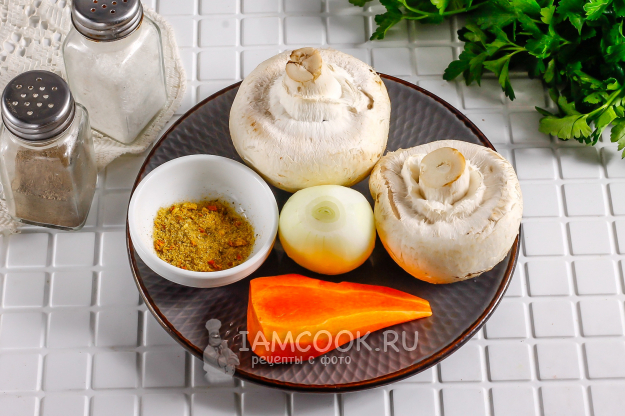 Подготовьте необходимые ингредиенты для создания красочного и аппетитного диетического грибного супа из шампиньонов. Лук и морковь очистите от кожуры и промойте в воде.