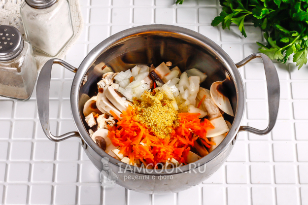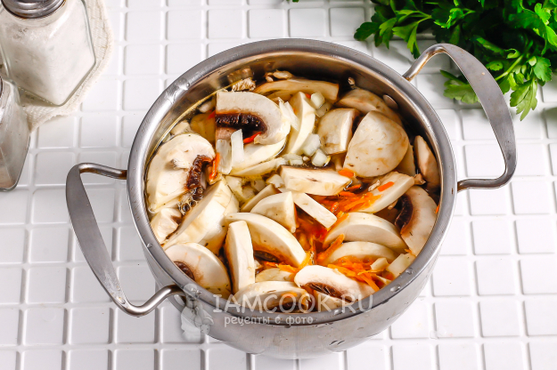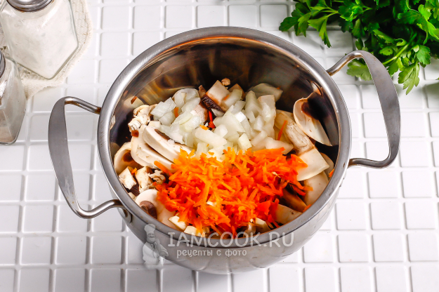 Нарежьте половину луковицы мелкими кубиками, а половину моркови натрите на терке с мелкими ячейками. Добавьте обе нарезки в кастрюлю с грибами. Все содержимое кастрюли отваривается примерно одинаковое количество времени.