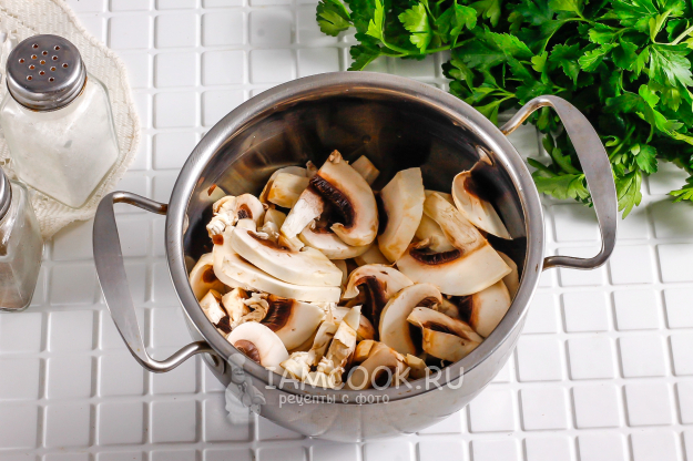 Грибы также промойте в воде и разрежьте пополам. Затем нарежьте каждую половинку слайсами и выложите нарезку в кастрюлю.