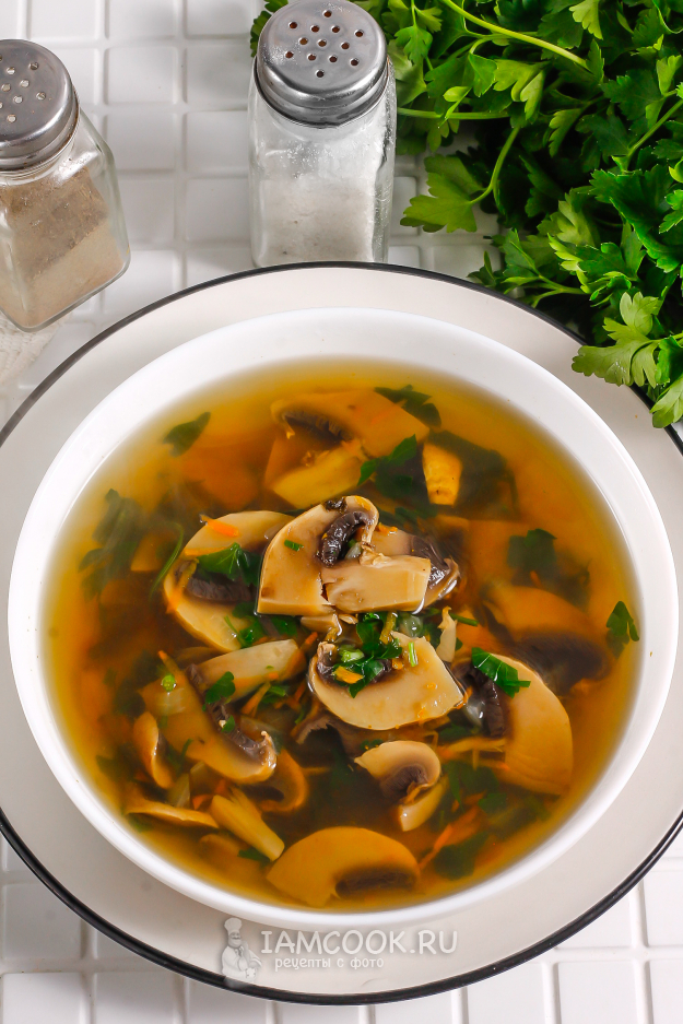 Диетический грибной суп из шампиньонов полностью готов! В нем нет ни капли жира!
