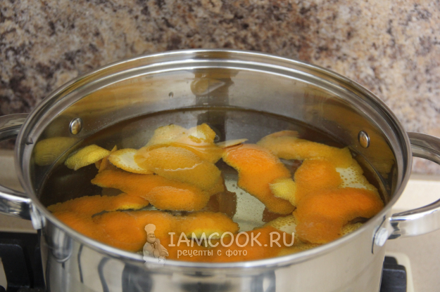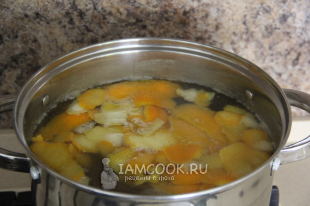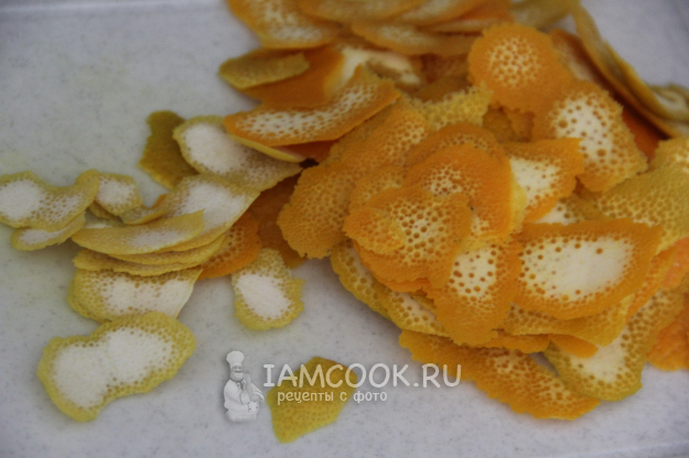 С цитрусовых снять корочки, по возможности с меньшим количеством белого слоя.