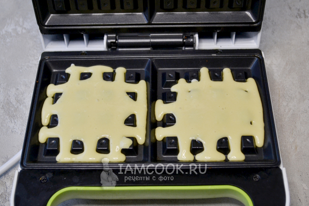 Разогрейте вафельницу. Если необходимо, то смажьте панели вафельницы растительным маслом и налейте по полной столовой ложке теста на одну вафлю. Удобно пользоваться ложкой от мультиварки.