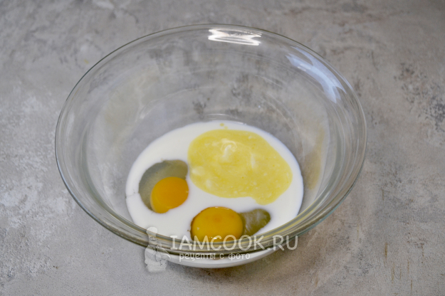 Влейте в миску молоко, растопленное сливочное масло и 3 капли ванильного экстракта. Венчиком перемешайте ингредиенты до получения однородной консистенции.
