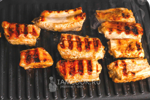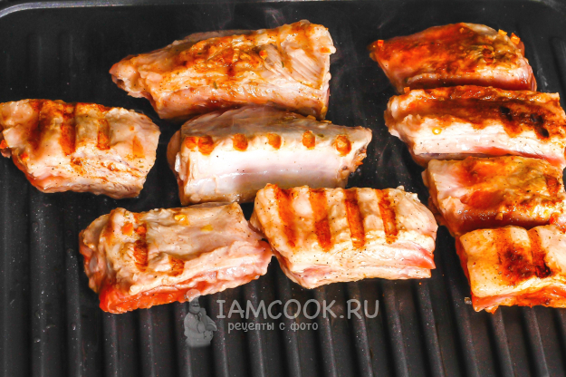 Прогрейте гриль и смажьте панели растительным маслом. Выложите на одну панель ребрышки и накройте другой. Обжарьте свиные ребрышки на электрогриле примерно 3-4 минуты, затем переверните ребрышки и обжарьте еще такое же количество времени.