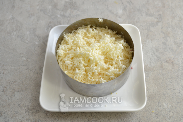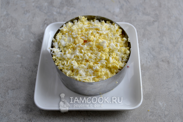 Салат "Черная жемчужина" делается слоями. Можно приготовить его в прозрачном салатнике или с помощью кулинарного кольца. Поставьте кольцо на плоскую тарелку и первым слоем положите половину натертых вареных яиц. Каждый слой немного уплотняйте и смазывайте майонезом.