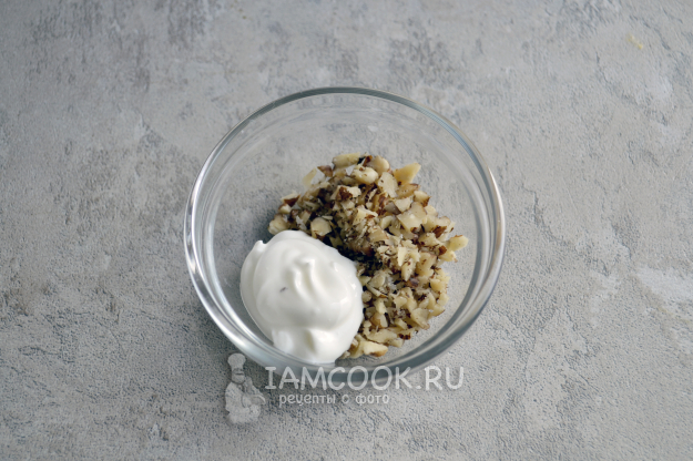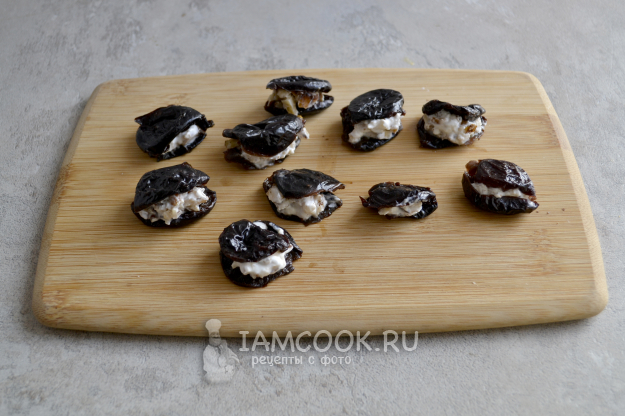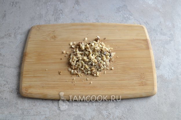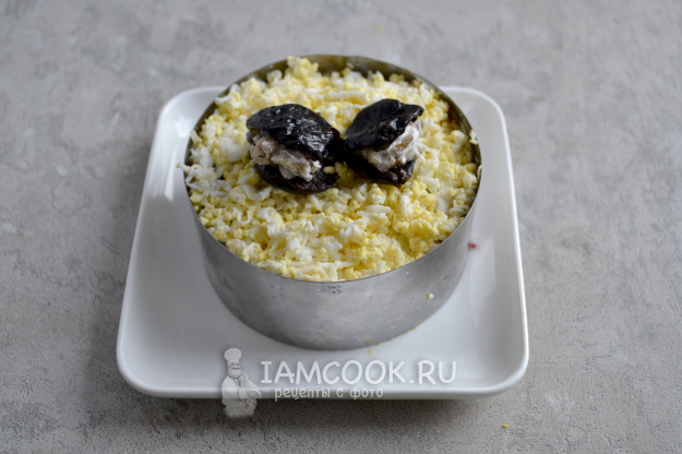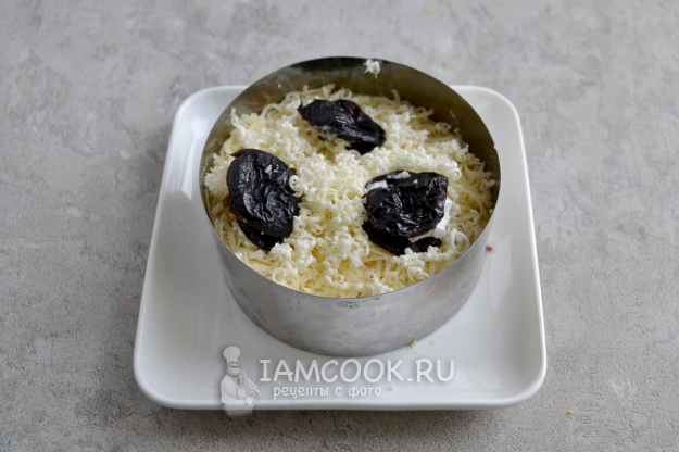 Украсьте верх салата черносливом и аккуратно снимите кулинарное кольцо.