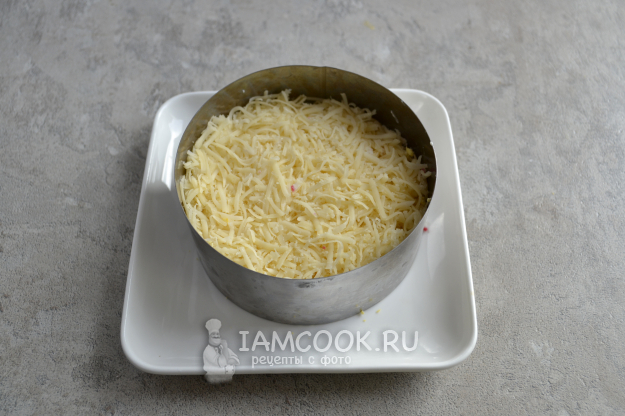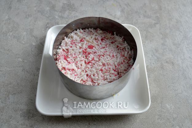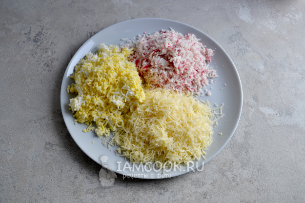 На мелкой терке натрите крабовые палочки, яйца, сыр.