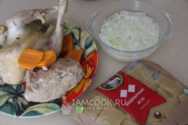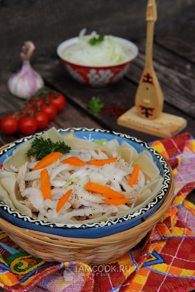 По желанию можно нарезать морковь, которая варилась с курицей, и выложить её с луком. Посыпать бешбармак молотым перцем.