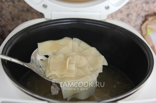 Выставить режим "Мультиповар" 100 градусов, и как только бульон закипит, посолить его по вкусу и опустить в бульон лапшу.