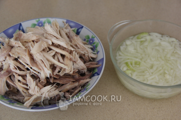 Достать курицу, грудку и овощи. Бульон процедить или очистить от пенки с помощью ситечка. Две луковицы почистить и нарезать на тонкие полукольца. Выложить лук в миску и залить уксусом и водой, добавить сахар. Перемешать лук с маринадом и оставить на 30 минут.