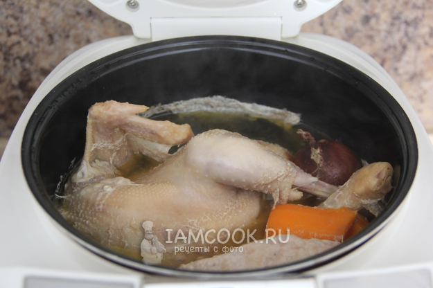 Установить режим "Тушение" на 2 часа и закрыть крышку мультиварки. Курочка хорошо разварится и мясо будет хорошо отходить от костей.