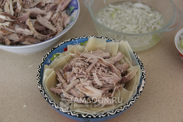 В глубокие пиалки выложить сначала лапшу, затем мясо. Сверху выложить маринованный лук и залить горячим бульоном.