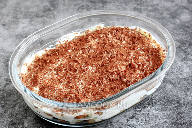 Крема хватило на три слоя печенья. Верх десерта украсьте тертым шоколадом и посыпьте какао через ситечко. Дайте десерту настояться в холодильнике или при комнатной температуре пару часов.