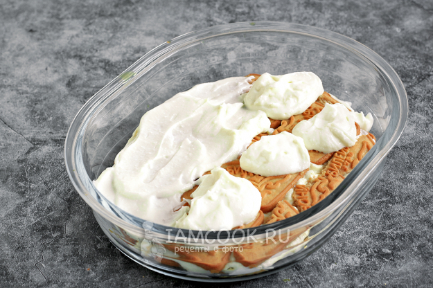 Печенье полностью погружайте в кофейный раствор и выкладывайте в ряд на дно формы. Пустые пространства я тоже заполняла кусочками печенья. Поверх печенья распределите слой творожного крема.