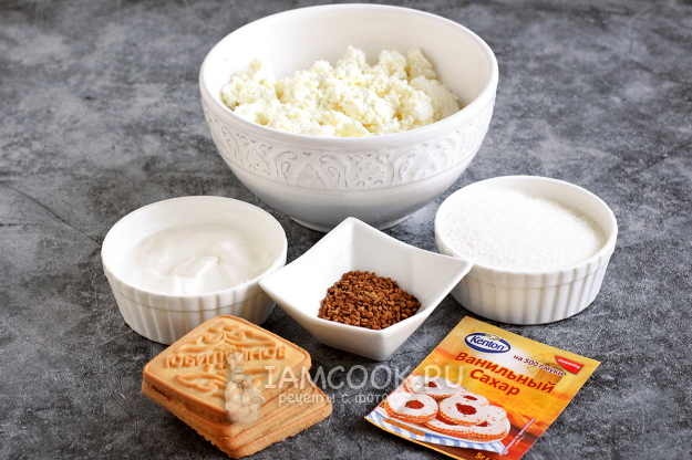 Чтобы приготовить Тирамису из печенья «Юбилейное» и творога, подготовьте все необходимое по списку ингредиентов.