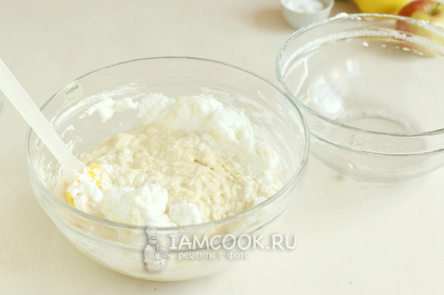 Перекладываем взбитые белки к основной массе и аккуратно смешиваем. Духовку разогреем до 180 градусов.