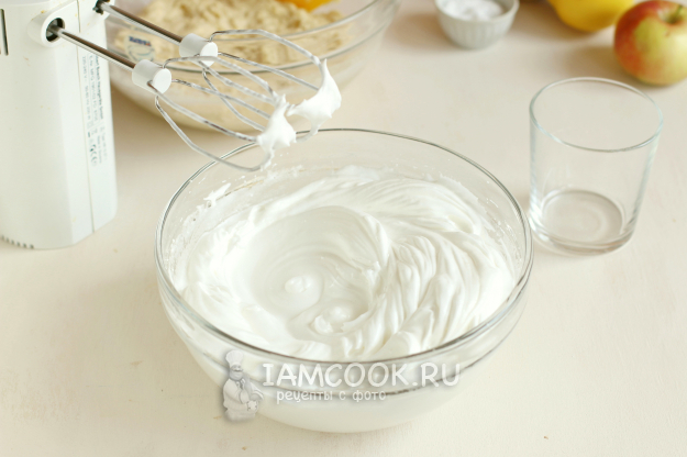 Далее взбиваем белки с оставшимся сахаром до пышности.