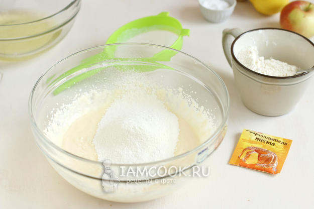 Просеем в эту массу муку с разрыхлителем и снова перемешаем.
