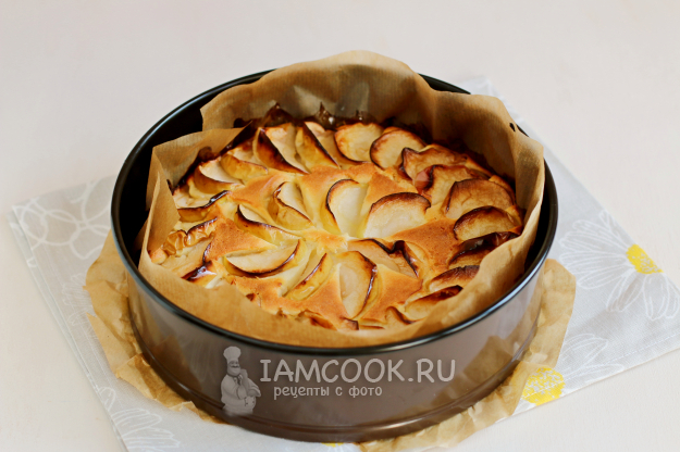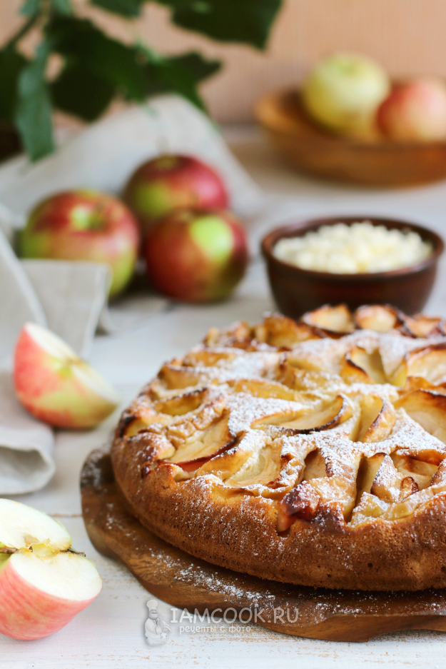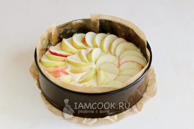 Поверх теста распределим дольки яблок и отправим форму в разогретую до 180 градусов духовку. Выпекать шарлотку с творогом и сметаной будем примерно 40-45 минут.