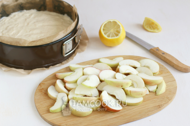 Затем нарежем яблоки небольшими дольками, сбрызнем обильно лимонным соком, который можно выжать заранее или просто разрезать лимон, выдавить сок на яблоки. Форму для выпечки застелем пергаментом, выложим в нее тесто.