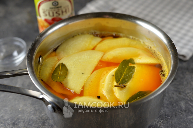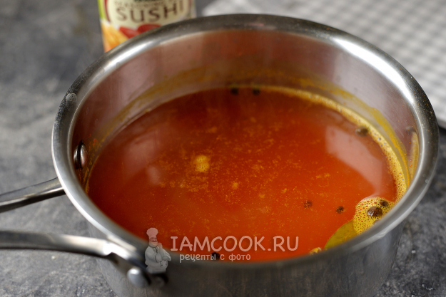 Доведите маринад до кипения, влейте уксус, всыпьте куркуму. Если нет рисового уксуса, его можно заменить на обычный 9%, вам понадобится 2 столовые ложки.