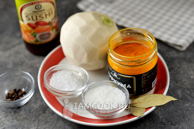 Возьмите все ингредиенты для приготовления маринованной редьки по-корейски в домашних условиях. Редьку очистите от кожуры, помойте под проточной водой. Редька для этого рецепта подходит любая, но лучше всего - белая, зеленая или дайкон.