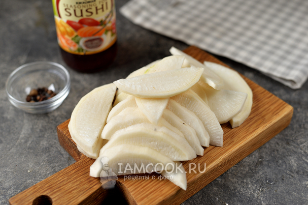 Разрежьте редьку на две части, затем каждую часть нарежьте на тонкие крупные ломтики.