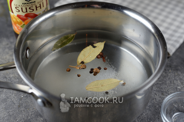 В сотейник влейте воду, всыпьте соль, сахар, положите оба вида перца, гвоздику и лавровый лист.
